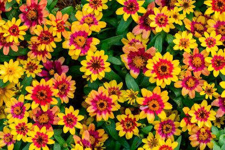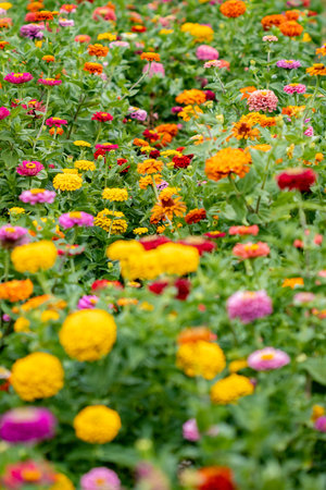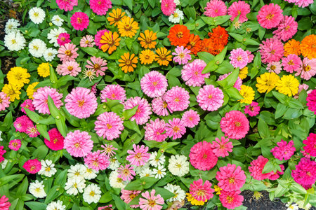 Colorful blooming zinnia blossoms in the garden.Summer milti colored background.Sunny weather.Arrangement of flowers.Floriculture.