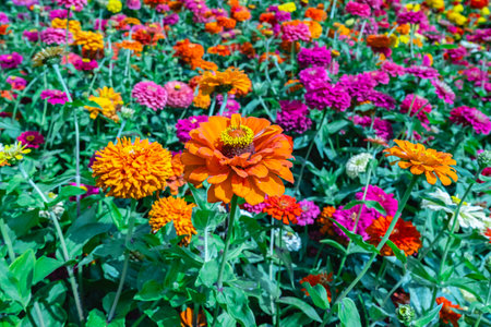Many zinnia flowers (Zinnia elegans) in sunny garden