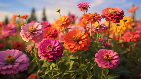 Colorful zinnia flowers blooming in the garden with blue sky background