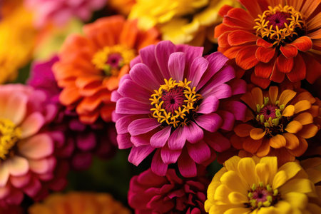 Close-up of colorful zinnia elegans flowers, showcasing their vibrant petals and delicate yellow florets