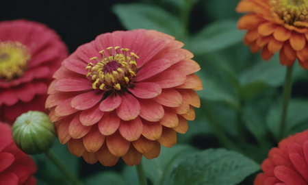 Red and yellow Zinnia flowers. Flowers zinnia elegans. color nature background. Common Zinnia or Zinnia elegans is one of the most famous flowering annuals of the genus Zinia