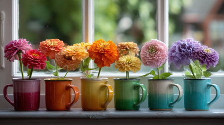 Zinnia flowers in a rainbow palette inside a row of mismatched mugs, cheerful kitchen windowsill.