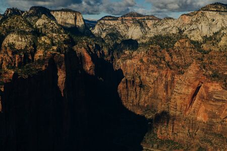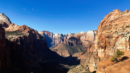View of Zion Canyon from Angels Landing,in Zion National Park, Utah. Blue sky with clouds. Travel concept after covid. Outdoor experience.