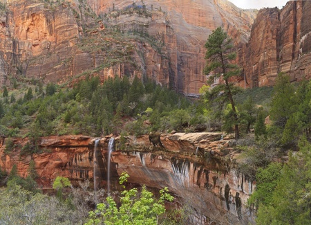 Water falls from a forested canyon over a red cliff at Emerald Pools in Zion National Park, Utah