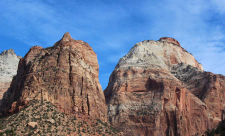 Large monoliths formed by water erosion formed by the Virgin River n Zion National Park Utah