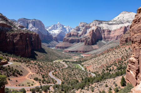 Top view of Zion National Park's stunning canyon landscape, with space for copy.