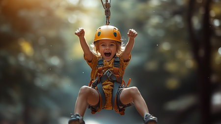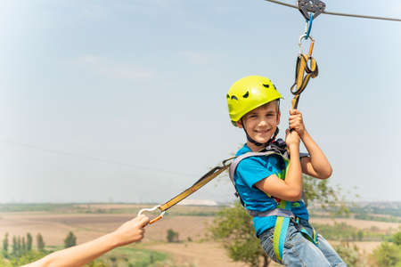 positive little boy ziplining at outdoor treetop adventure park being active and brave