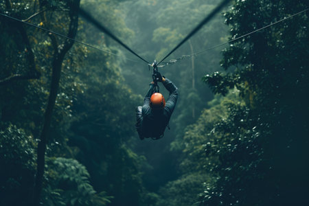 A daring individual rides a zip line high in the jungle canopy, soaring through lush greenery and experiencing an exhilarating adventure in the midst of nature.