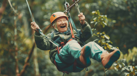 Elderly woman ziplining through lush forest, expressing thrill and excitement