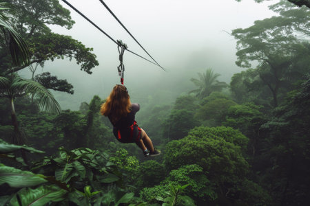 Adventurous ziplining experience through a misty tropical rainforest, with lush greenery and foggy atmosphere