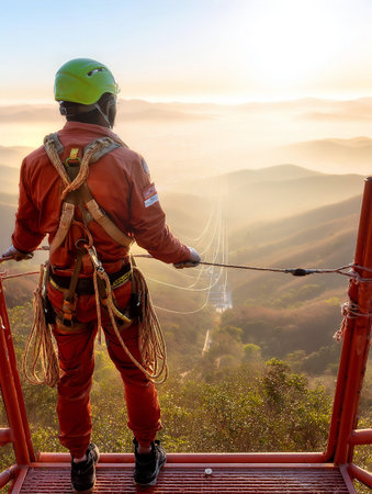 Silhouette of a climber in orange uniform and helmet with rope on top of the mountain.