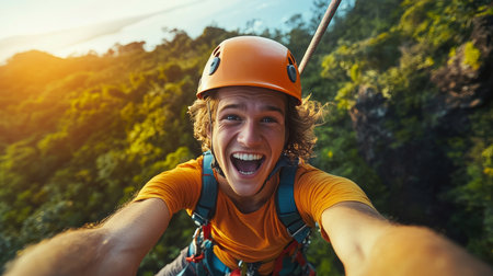 Thrilled Man s Joyful Scream Extreme Zipline Adventure through Lush Tropical Rainforest Canopy