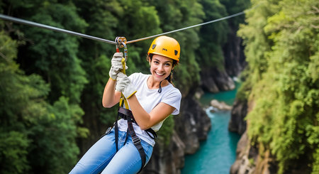 Zip Line Adventure: Young woman enjoying a zip-lining experience over dense forest terrain.