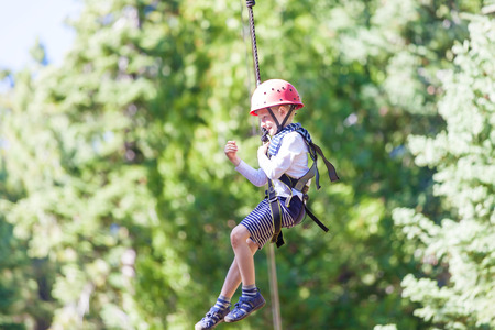 Happy school girl enjoying activity in a climbing adventure park on a summer day
