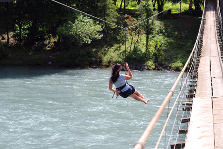 A girl of unrecognizable appearance descends a tightrope on a zipline at a high altitude. Attraction on the background of mountains covered with forest