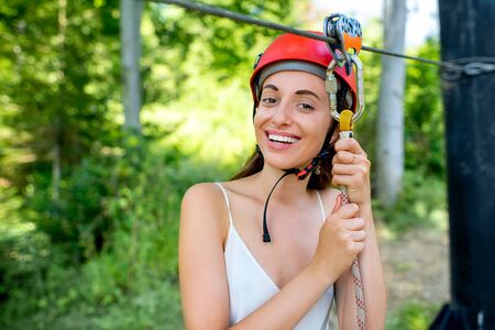 Young and pretty woman in red helmet enjoying riding a zip line in the forest. Active summer sports recareation