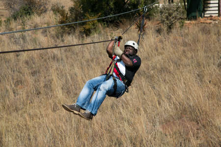 Johannesburg, South Africa - August 28 2013: Diverse Adults having fun on a Zip Line ride in the countryside