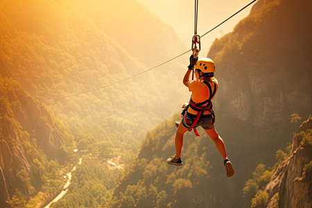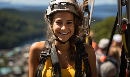 Female Tourist Wearing Informal Attire While Ziplining. AI