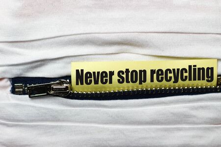 White fabric with zipper close-up. Sticker with text or caption: Never stop recycling