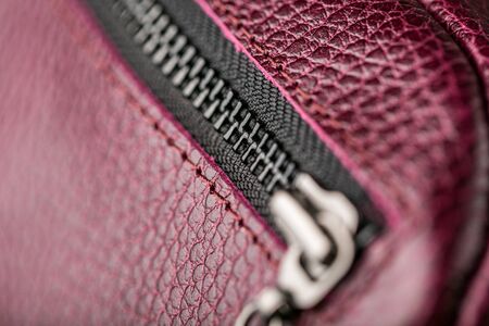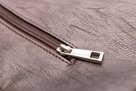Closeup of a zipper on a brown leather bag. Selective focus.