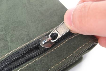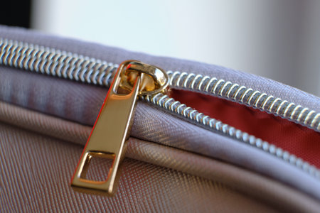 Golden brass zipper on a leather bag. The female is moving zipped open the bag. with copy space for your text.