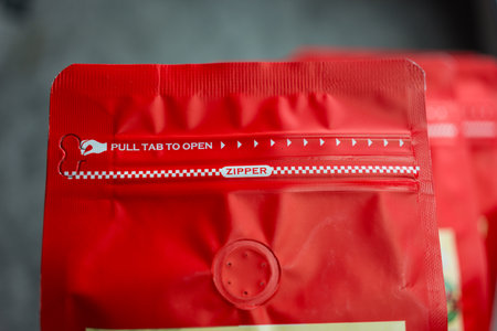 Front view of red coffee bean pack with zipper.