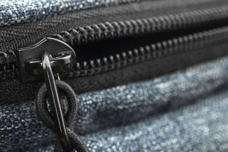 Black textile accessories material zipper metal macro on blur background