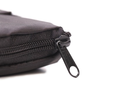Plastic black zipper of case. White background.