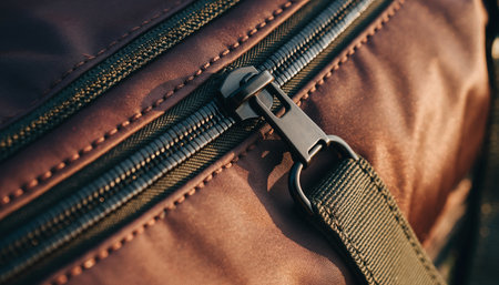 close up of zipper on brown leather bag