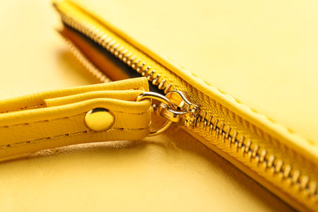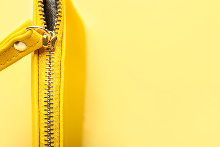 Cosmetic bag with metal zipper on yellow background, closeup