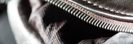 Close up of the zipper on the black leather bag. Selective focus.