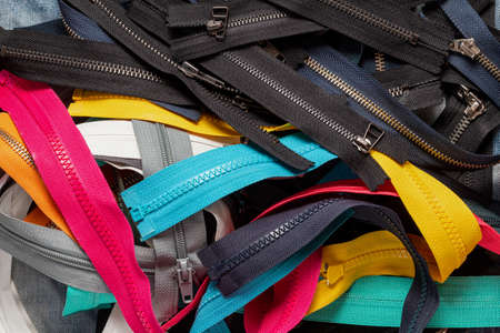 Zip background texture of zippers sliders. a lot of zippers in different colors. sewing clothes, atelier, fabric and accessories shop. hobby diy concept
