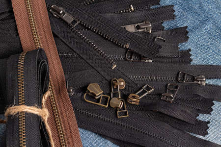 Pack a lot of black brown metal brass antique zippers stripes with sliders pattern for handmade sewing tailoring haberdashery leather craft on the blue denim background