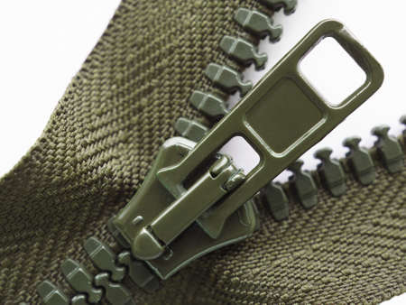 Green or olive zipper slider very close-up on a white background. not isolated. Sewing production, home handicrafts, sewing materials and accessories. high detail. Shot with a macro lens