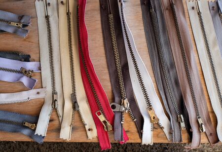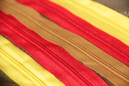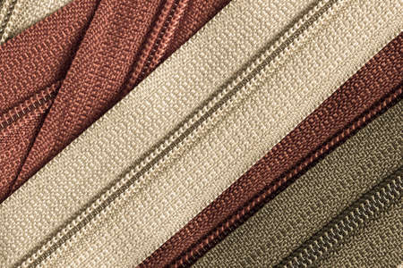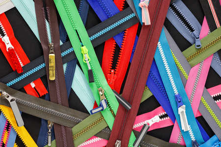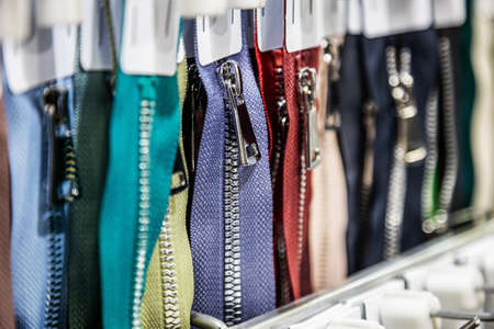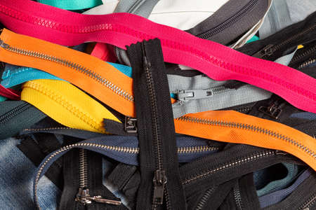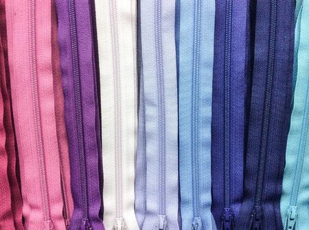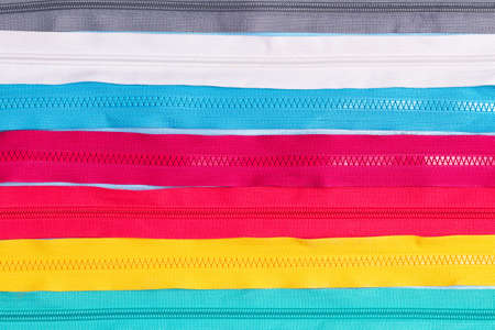 Zip background texture of zippers sliders. a lot of zippers in different colors. sewing clothes, atelier, fabric and accessories shop. hobby diy concept