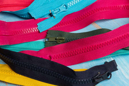 Pack lot of colorful plastic and metal zippers stripes with sliders pattern for handmade sewing tailoring on the blue painted wooden background close up selective focus