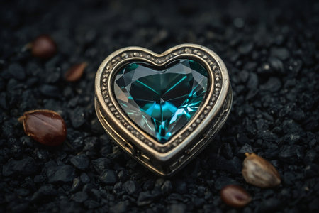 An artistic close-up of black diamonds resting on dark soil, surrounded by glimmering gold flakes, showcasing elegance and beauty in nature