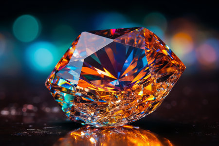 Large, sparkling diamond resting on a dark blue reflective surface, creating a luxurious and elegant atmosphere with a beautiful bokeh effect in the background