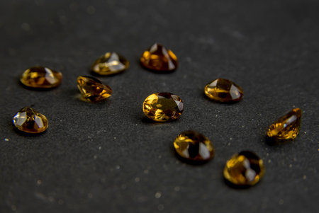 Yellow diamonds of various shapes lie scattered on a textured dark stone surface. Their brilliance catches the light creating a stunning display of color and reflection.