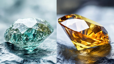 A stunning close-up of an aquamarine and a golden diamond reflects light beautifully on a smooth surface, capturing the essence of luxury and elegance.