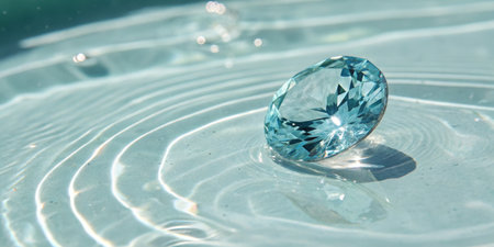 A striking blue gemstone rests on the surface of clear water, creating delicate ripples and reflections under bright sunlight. The peaceful setting highlights the gem's intricate cut.