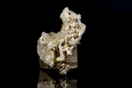 Macro mineral stone Pyrite in quartz on a black background close up