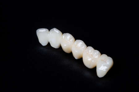Dental crowns on a black background. Dental prosthetics.