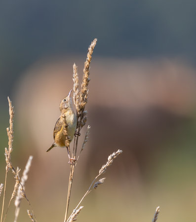 Grasshopper Warbler (Locustella naevia). Russia, the Ryazan region (Ryazanskaya oblast), the Pronsky District, Denisovo.