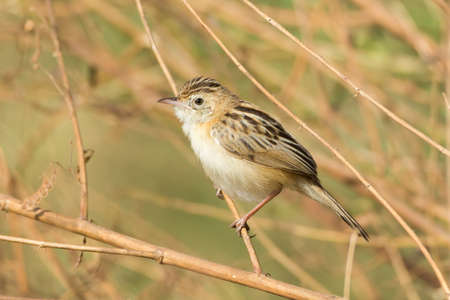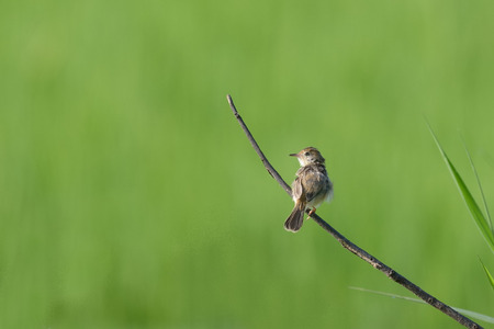 Small warbler bird Zitting cisticola or Cisticola juncidis perched on a branch