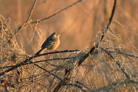 A Seaside Sparrow perched in the marsh grass in the early morning sunlight.