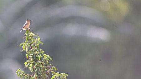 Close up of a female Stonechat, Saxicola rubicola, perched on a branch surrounded by green nature and flowers lit by the low standing morning sun.