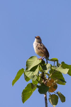 Little brown songbird Rattling Cisticola perched on treetop during safari in Arusha National Park in Tanzania East Africa
