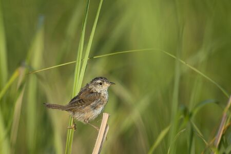 A very small Marsh Wren perched in the tall bright green marsh grasses in the bright morning sunlight.