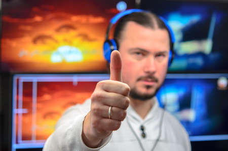 Photo of the video broadcast editor with headphones watching an action on the monitor. Live TV broadcasting process